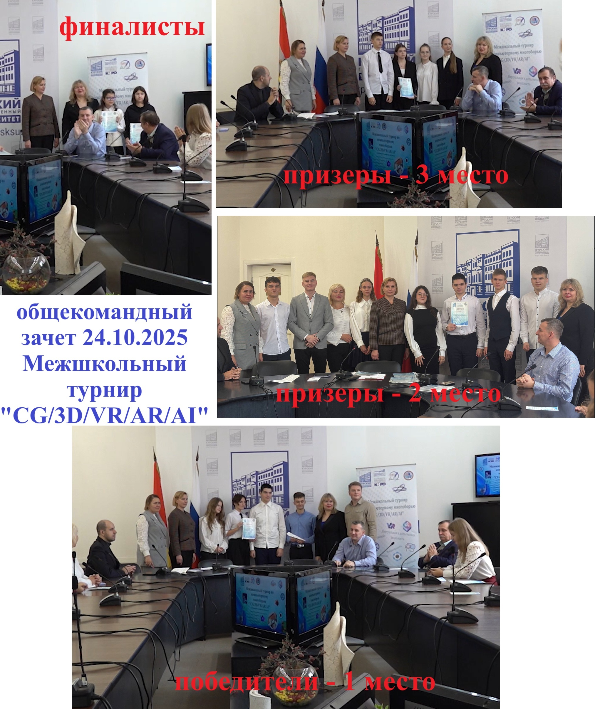 23 — 24 октября 2025 года прошёл межшкольный турнир по компьютерному многоборью «CG/3D/VR/AR/AI». Мероприятие было организовано Курским государственным университетом и МБОУ «СОШ № 59 им. Г.М. Мыльникова» совместно с Курским институтом развития образования, Научно-методическим центром города Курска. На подключении был город-Герой Севастополь. Обучающиеся соревновались в пяти турах: «Компьютерная графика», «3D-моделирование,  «Виртуальная и дополненная реальность», «Искусственный интеллект и нейросети», «Видеоролик». Два этапа — создание модели и графического рисунка — прошли в смешанном формате (Курские команды приезжали в МБОУ «СОШ № 59 им. Г.М. Мыльникова», другие команды были на подключении дистанционно). Остальные задания команды выполнили заранее, чтобы эксперты могли их оценить в заочном этапе. За каждый тур команда моглаполучить до 20 баллов. Итого — до 100 баллов по всем турам. Каждая команда могла участвовать как в одном туре, так и во всех пяти.